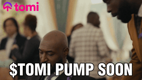 A man in a brown suit leans in to whisper to another man, with the text "$TOMI PUMP SOON" overlaid.