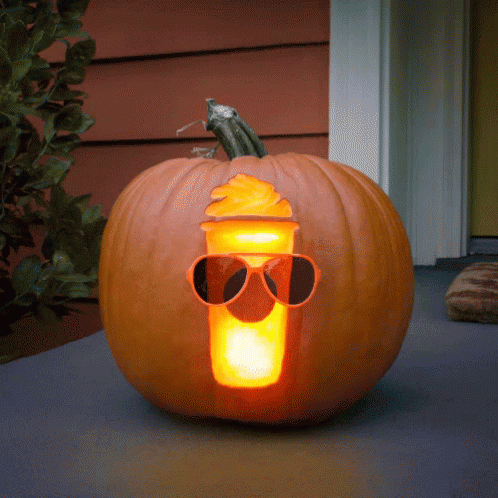 A creative carved pumpkin featuring a glowing Pumpkin Spice Latte with sunglasses.