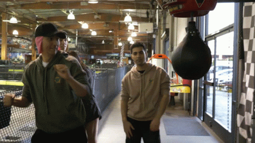 Mattakhavan, from Flyquest, attempts to punch a boxing machine while blindfolded in an arcade setting.