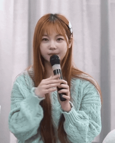 Punch CGM48 gives a cheerful thumbs-up while holding a microphone during a performance.