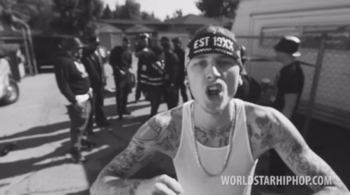 Machine Gun Kelly (Colson Baker) makes punching gestures in a black and white performance clip.