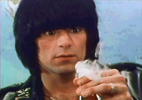 Man with long dark hair and leather jacket holds a smoking object, embodying a punk rock aesthetic.