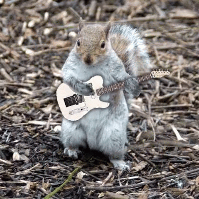 A cute squirrel, known as Punkrobot Ardilla, stands upright and 'plays' a miniature electric guitar.