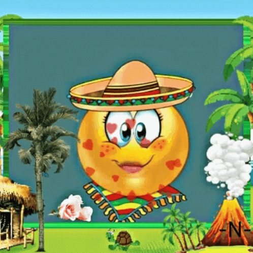 A cheerful smiley face wearing a sombrero and colorful shawl, blowing kisses with hearts.