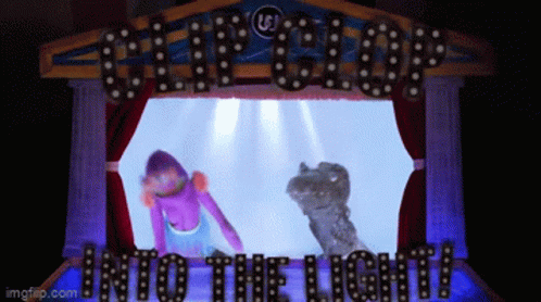 The Professor and a horse puppet perform on the Puppet History stage with 'Clip Clop Into The Light!' text.