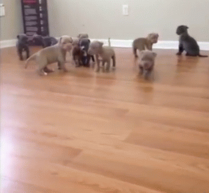 A group of adorable puppies, including light brown and dark ones, excitedly run across a wooden floor towards the camera.