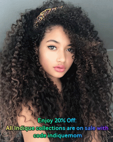 Stunning woman models Pure Curly Lace Front Wig. Enjoy 20% off all Indique collections with code indiquemom.