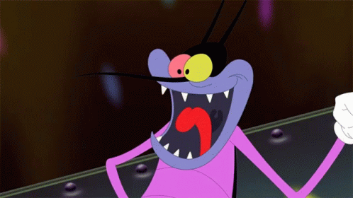 Oggy, the purple cartoon character, excitedly pushes a green button with a wide, toothy grin.