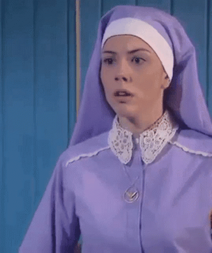 Beatriz Arantes, dressed as a nun, playfully pushes another nun who falls onto a bed in a lighthearted scene.
