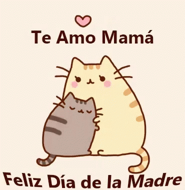 Pusheen the cat and a smaller cat hug, with a 'Happy Mother's Day' message in Spanish.