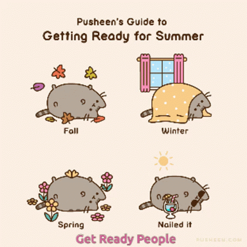 Pusheen Cat's adorable guide to getting ready for summer, featuring seasonal activities for fall, winter, and spring.