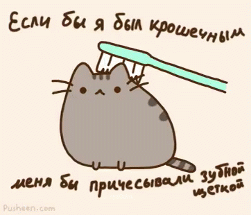 Pusheen the cat imagines being tiny and brushed with a toothbrush, a charming and cute animation.