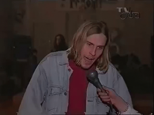 A long-haired man being interviewed makes a peace sign and eats a white substance from his fingers.
