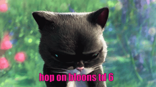Puss In Boots makes a sad face with big eyes, asking viewers to 'hop on Bloons TD 6'.