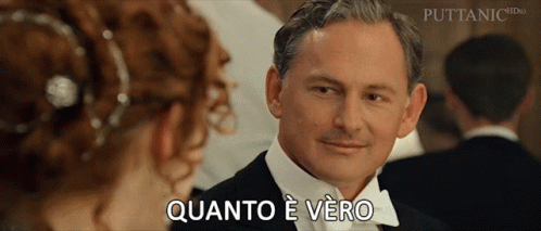 Cal Hockley from Titanic says 'Quanto è vero' to Rose DeWitt Bukater in a formal setting.