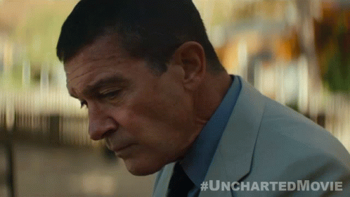 Antonio Banderas as Moncada puts on sunglasses, looking resentful in a scene from the Uncharted movie.