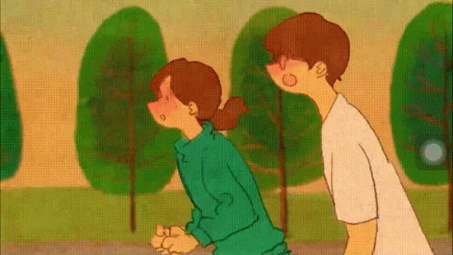 Puuung's animated couple enjoys a peaceful run through a lush green park, exercising together.