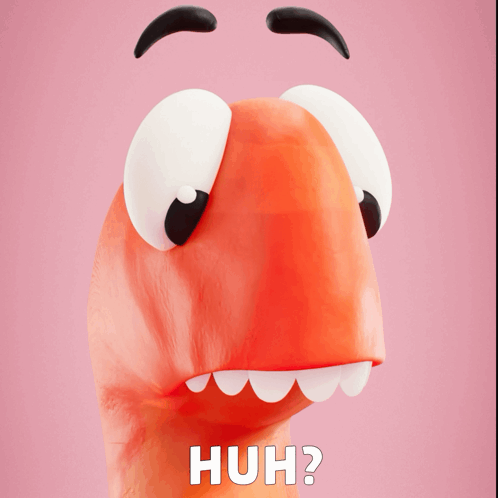 A Claynosaurz cartoon character with big eyes and a wide mouth looks utterly puzzled, asking 'HUH?'