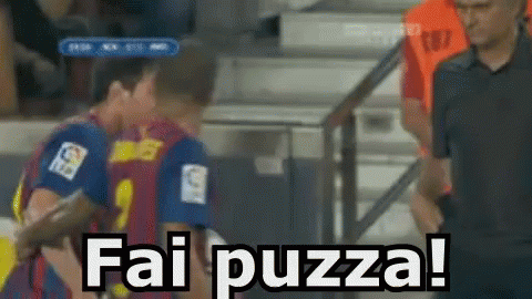 Two football players on the field with the Italian text 'Fai puzza!' (You stink!) displayed on screen.