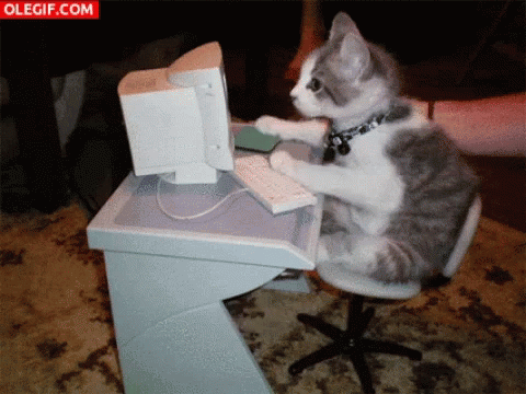 A cat 'working' at a tiny computer desk, illustrating 'Primer Empleo' (First Job) for PVEM Edomex.