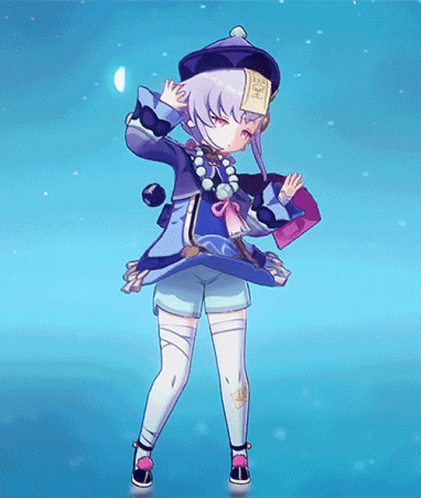 Qiqi, the Cryo zombie character from Genshin Impact, performs a charming animation in her signature blue and purple outfit.