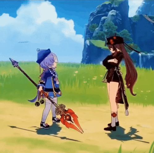Qiqi and Hu Tao, characters from Genshin Impact, stand facing each other in a vibrant green field.