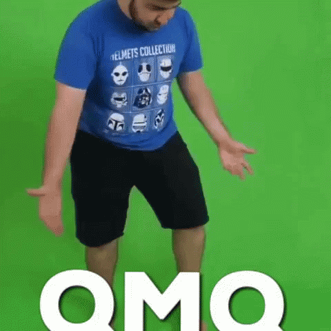 Man in blue 'Helmets Collection' shirt and black shorts looking down on a green screen with 'QMQ' text.