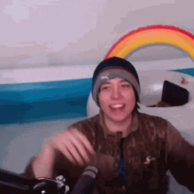 Qnf Quackity throws a pillow onto a bed where georgenotfound is resting in a dimly lit room.