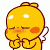 Qoobee Agapi, the yellow cartoon character, blushes shyly then gives a smug, sly look.
