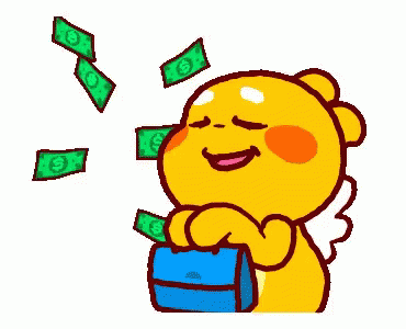 Qoobee Agapi, the cute cartoon character, happily receives a shower of money while holding a blue purse.