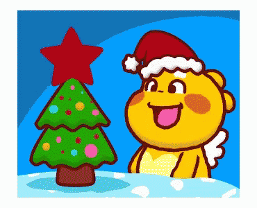 Qoobee Agapi, wearing a Santa hat, stands next to a decorated Christmas tree with a glowing star.
