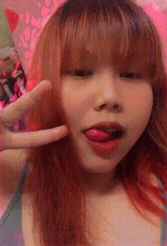 A girl with red hair and bangs makes funny faces, sticking her tongue out and pointing at her cheek.