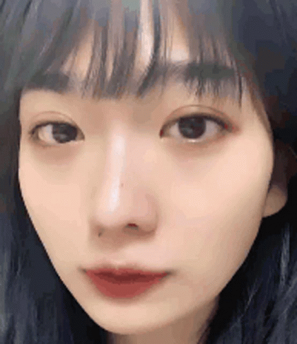 Close-up of a woman's face with dark, possibly blue-tinted hair and bangs, wearing striking red lipstick.