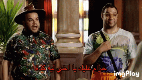 Two men stand together, one gesturing animatedly while an Arabic caption reads 'Shame on you, my brother, why like this?'