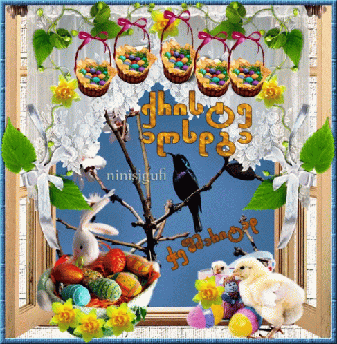 Christ is Risen! Happy Easter with festive baskets, colorful eggs, a bunny, and chicks.