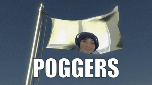 Quackity's face on a flag with 'POGGERS' text, waving against a blue sky.