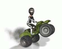 A cartoon character performs an impressive wheelie on a green quad bike, kicking up a cloud of smoke.