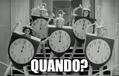 A group of people dressed as clocks dance, asking 'When?' in a classic black and white scene, reflecting on time and boredom.