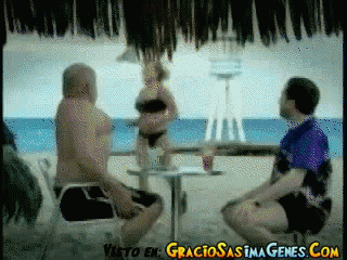 A man with a 'good body' humorously dances on the beach while another man watches.