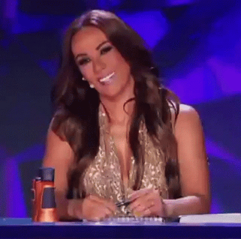Consuelo Duval enthusiastically laughing and cheering on a TV show set, wearing a sparkling gold dress.