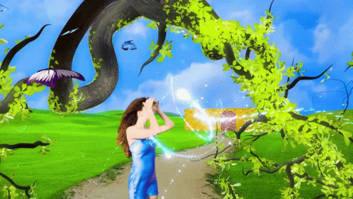 Dani is amazed in a magical, dreamlike landscape with glowing lights and butterflies.