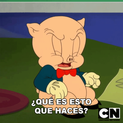 Porky Pig looks confused, asking 'What are you doing?' in a classic Cartoon Network scene.