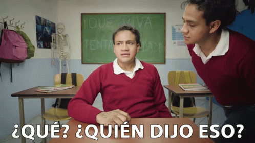 Man in red sweater reacting in a classroom, asking "¿QUÉ? ¿QUIÉN DIJO ESO?" from a comedic sketch.