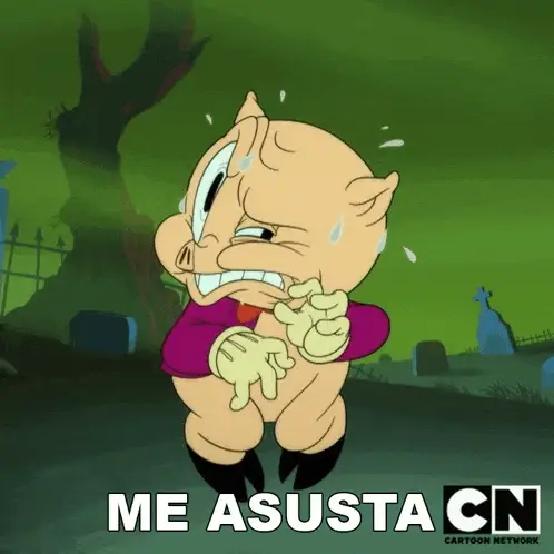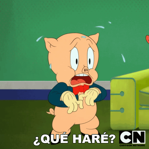 Porky Pig is in a state of panic, sweating and asking 'What will I do?' as he faces an unknown dilemma.