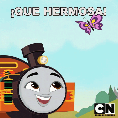 Nia, the train from Thomas & Friends, admires a beautiful purple butterfly, exclaiming '¡Qué Hermosa!'