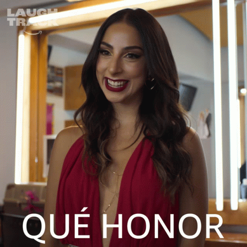 Samantha Echeverria in a red dress, smiling, with the phrase 'Qué Honor' (What an Honor).
