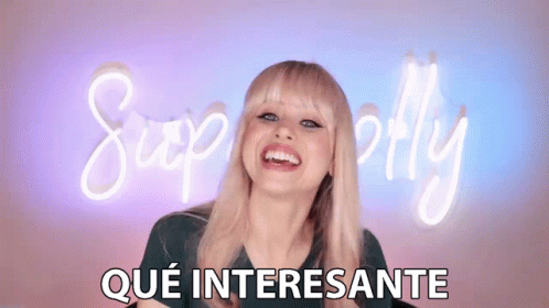 Superholly smiles brightly in front of a neon sign, exclaiming "Qué Interesante" (How Interesting).