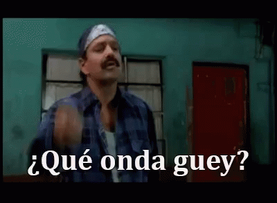 A man with a mustache and bandana asks "¿Qué onda guey?" in front of a teal wall with a red door.