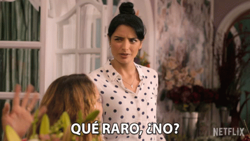 Aislinn Derbez as Elena De La Mora in La Casa De Las Flores, saying 'Qué raro, ¿no?' with a confused expression.