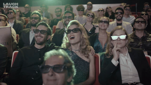 Andy, Natasha Esca, and an audience in 3D glasses burst into laughter at a movie, featuring a 'Laugh Track'.